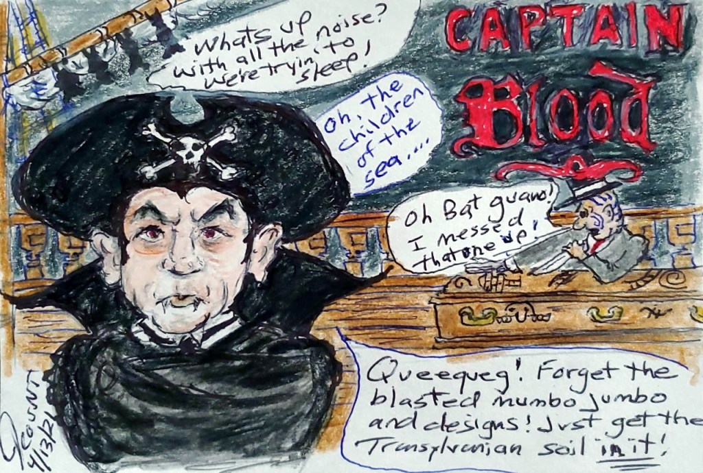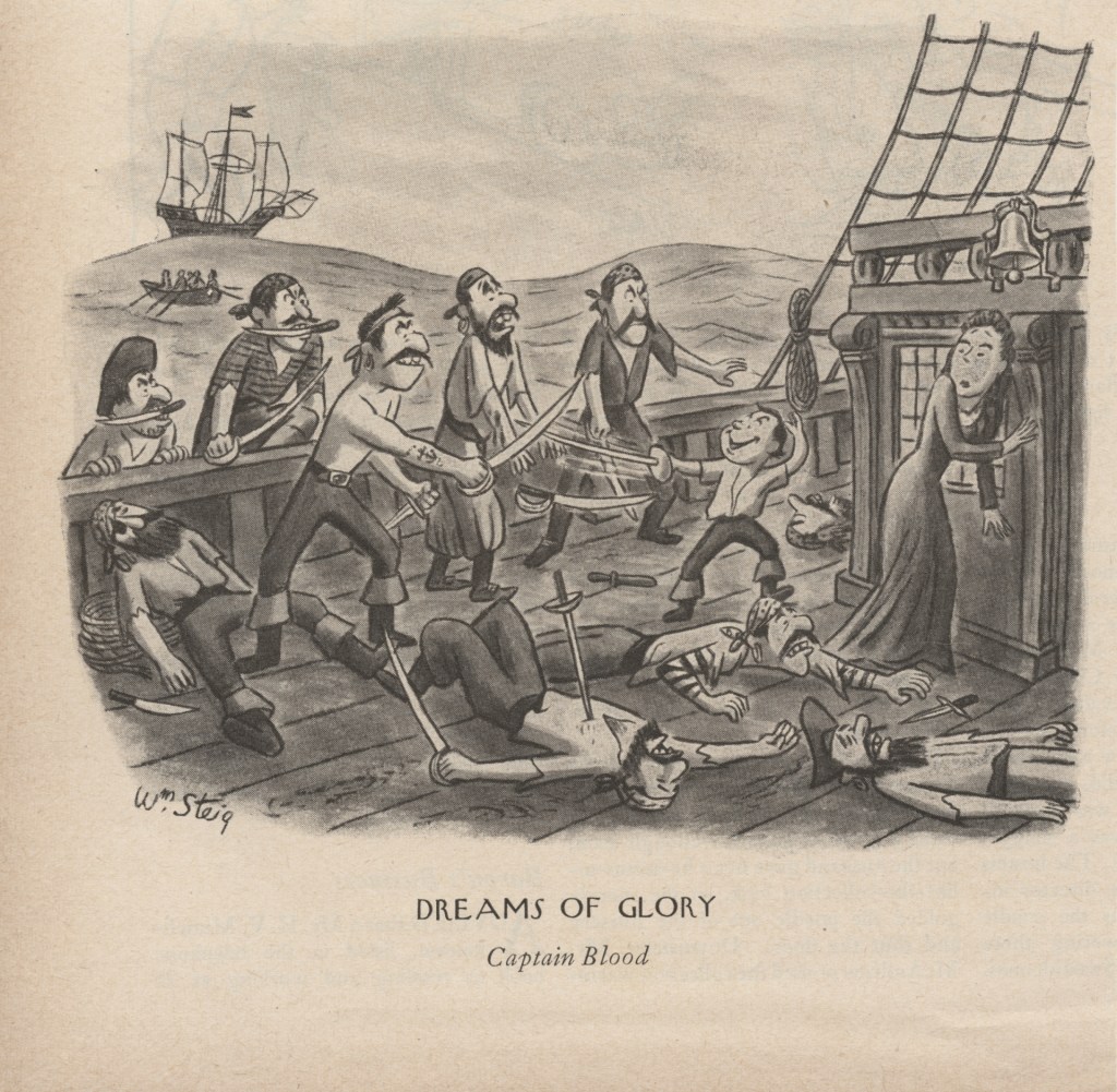 —Errol Flynn as the fictional Captain Peter Blood in Captain Blood (Warner Bros., 1935, Casey Robinson screenwriter) during the finale against the French fleet at Port Royal, Jamaica, from the gun’l, his ship sinking, just before he swings Hollywood-style from ship to ship, leading his men in a boarding action. The line is not in the published script, but apparently was written or adlibbed during filming. The original line was “Over we go, lads!” Flynn also uses much of Sabatini’s language above prior to boarding.