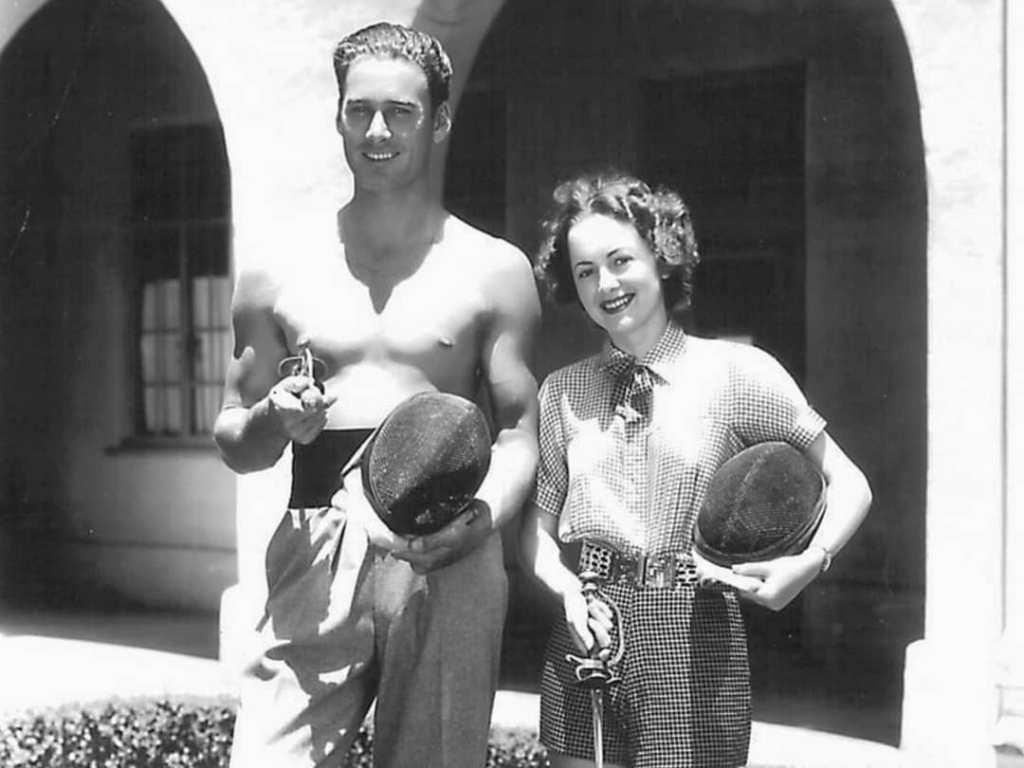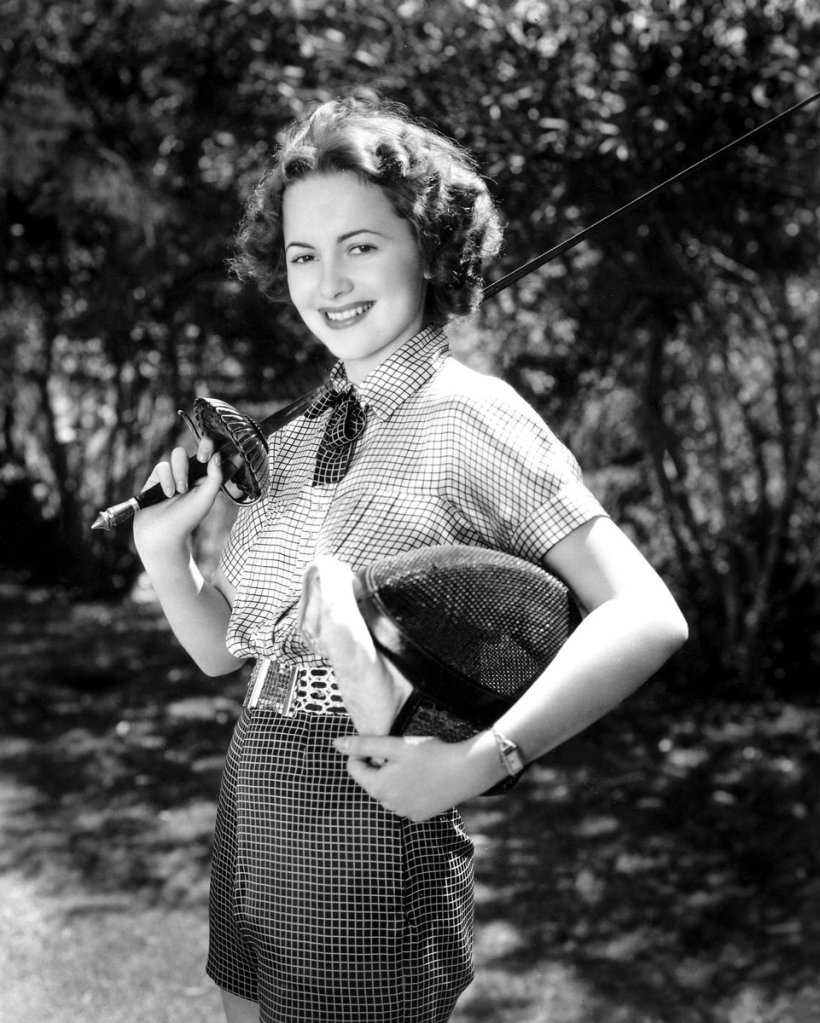 Olivia de Havilland, star of Captain Blood, The Adventures of Robin Hood, and numerous other films, posing with stage rapiers and smallswords, fencing masks, and star-to-be Errol Flynn in a series of Warner Bros. publicity stills for Captain Blood (1935). Most of these photographs were taken on the same day in July 1935 behind the Warner Bros. administrative building prior to the start of shooting. Ms. de Havilland passed away on July 26, 2020 at the age of 104.