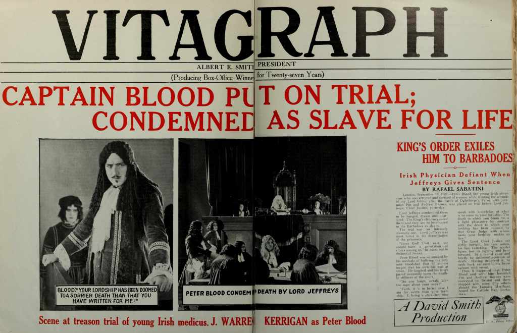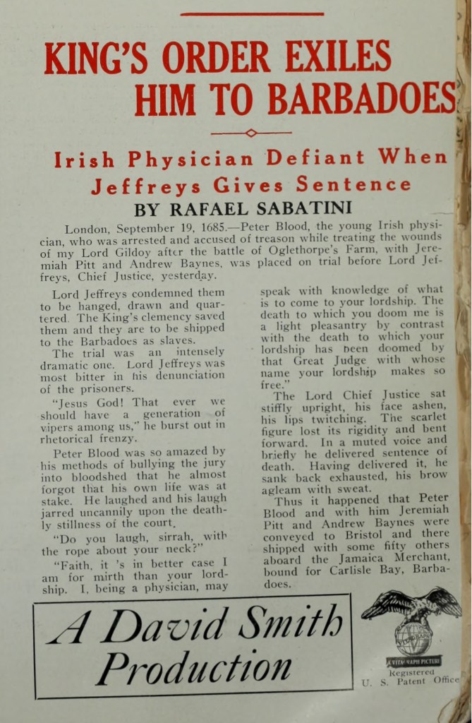 In support of the 1924 Captain Blood starring Walter Kerrigan, Vitagraph issued a series of advertisements in the form of newspaper headlines and articles, with text credited to author Rafael Sabatini:
