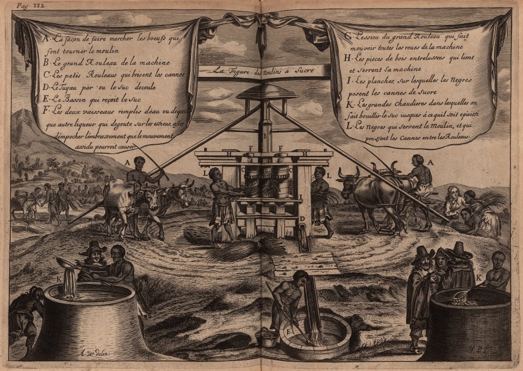 A rather fanciful representation of what is perhaps meant to be–and should be–a sugar mill. In reality in Barbados the wheel would be for pressing sugar cane and would be driven by a windmill, “water mill,” or a team of oxen (or occasionally mules). Further, nearly all of those doing the work would not be white servants, as shown here, but African slaves. Publicity still from Captain Blood (Warner Bros., 1935).French sugar mill for pressing sugar cane. From Histoire naturelle et morale des iles Antilles de l’Amerique by Charles de Rochefort, 1665. John Carter Brown Library.