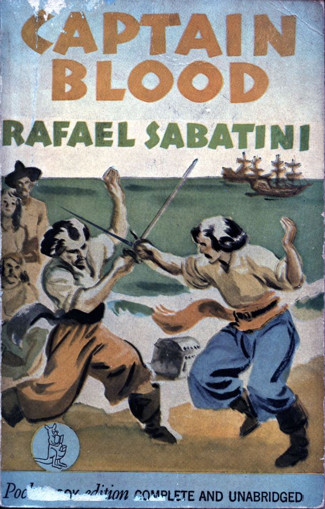 Pocket Books edition, UK, 1940, with color restored from a faded copy. The artwork is intended to represent the duel on the beach between Peter Blood and Levasseur.