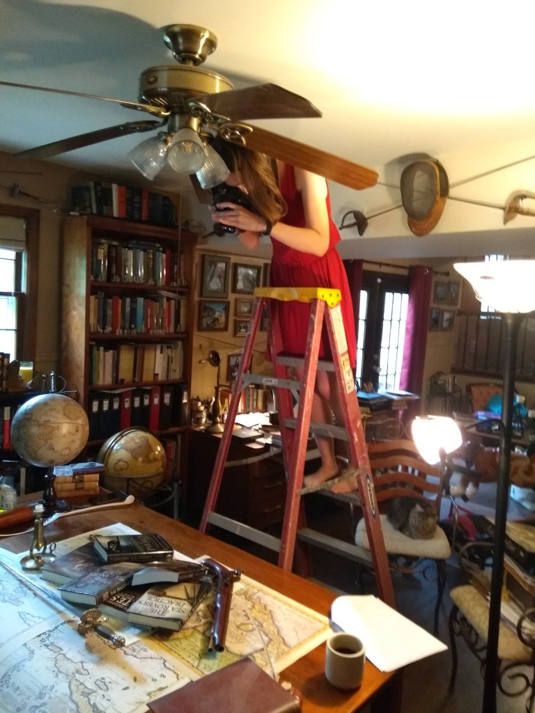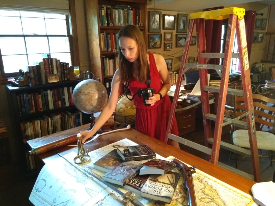 The images are of Marguerite (Bree) Little shooting still photographs for our first video. It’s always useful to have lots of antique and reproduction props at hand (not to mention a visiting daughter who’s also a great photographer).