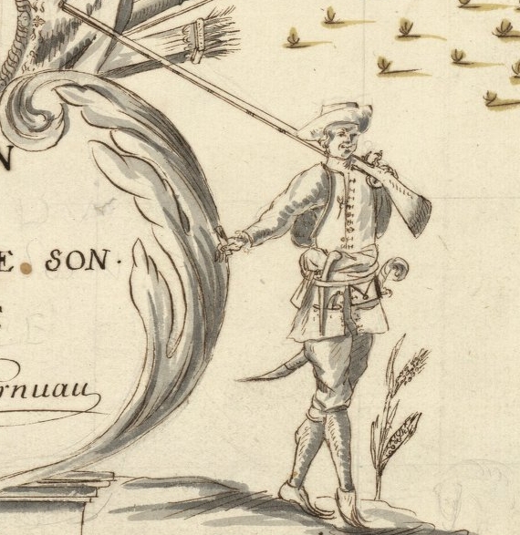 The probably French buccaneer on the far left in the illustration above is a detail from De Americaensche Zee-Roovers by A. O. Exquemelin, 1678, in the Library of Congress; the probably Dutch buccaneer at left center is a detail from Historie der Boecaniers, of Vrybuyters van America by Alexandre Exquemelin, 1700; the French buccaneer at right center is an eyewitness illustration, that is, what one truly looked like, a detail from a chart of Petit Goave drafted in 1688 by Paul Cornuau, Archives Nationale d’Outre-Mer; and on the far right is Errol Flynn in a detail from a publicity still for Captain Blood, Warner Bros. 1935.